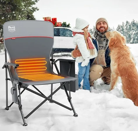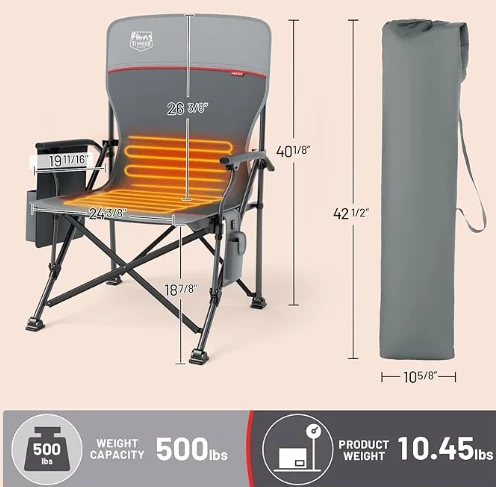 כסא מתקפל מחומם בהתאמה אישית, אזורי חימום כפולים לחימום של גב ומושב של עד 131 מעלות צלזיוס תוך 10 שניות בלבד. שלוש הגדרות חום (104 מעלות צלזיוס, 122 מעלות צלזיוס, 131 מעלות צלזיוס) מספקות חום לכל אירוע חיצוני (הסוללה לא כלולה).