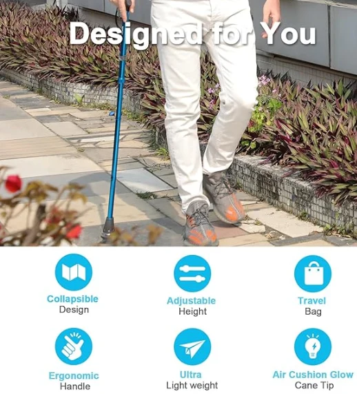 קנה הליכה טלסקופי מתקפל, הקצה מדליק את עצמו בלילה, שמבטיח מאוד את בטיחות ההליכה הלילה. (עם חשיפה באור לזמן מסוים בלבד, חרוט הזוהר מגיע לראות בחושך.