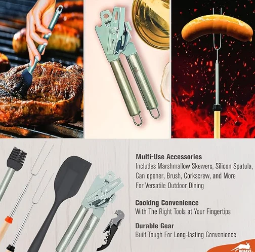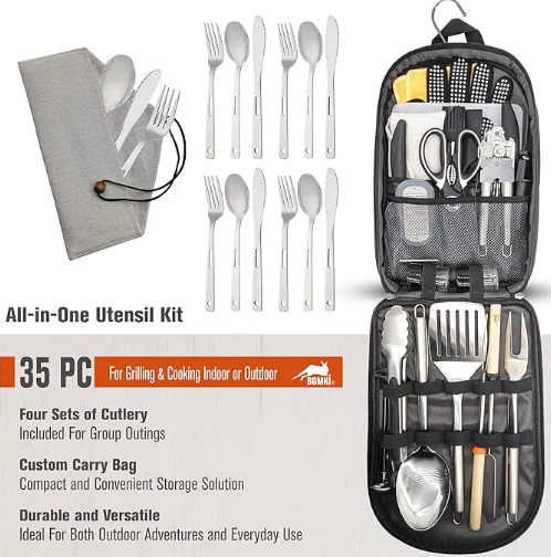 תיק אחסון כלי בישול חיצוני קמפינג ערכת כלי בישול קמפינג זה 35 מחשב זה הוא פיתרון שלם לצרכי הבישול החיצוניים שלך. הוא כולל סט מטבח קמפינג וכלי קמפינג סט בישול, כולם ארוזים בצורה מסודרת בתיק בהתאמה אישית עם תאים נוספים ושני כיסים אחוריים. הסט נועד לספק את כל חיוני הבישול הקמפינג שלך, מה שהופך אותו לתוספת חיובית לציוד הקמפינג שלך