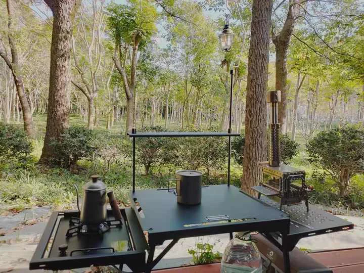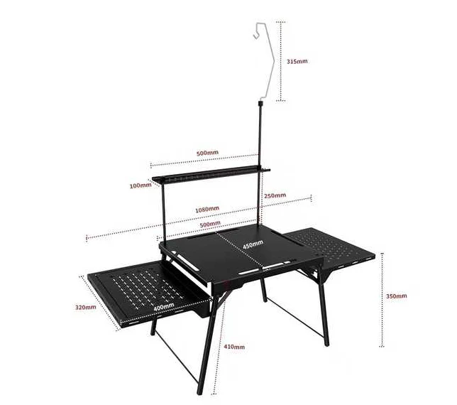 שולחן קמפינג אלומיניום ברזל מתקפל נייד, פלטפורמת שולחן האוכל מורכבת מחלקים עליונים, אמצעיים ותחתונים, עם מספיק מקום לאחסון כל מיני כלי שולחן, אוכל ותבלינים.
