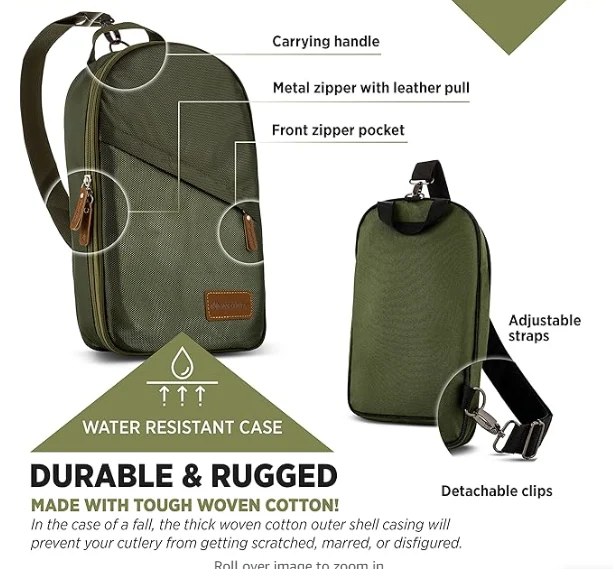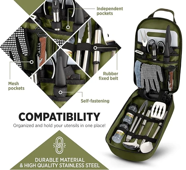 תיק כלי קמפינג חיצוני נייד, לכל כלי יש כיס ייעודי משלו, כך שיחידות לא נמרחות, נשרטו או פגומות באחסון או במעבר. מספק גישה נוחה לכלי הבישול שלך והוא מצויד בחותם מיקוד מאובטח
