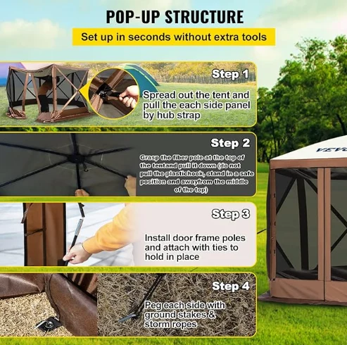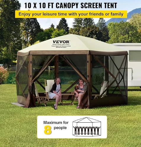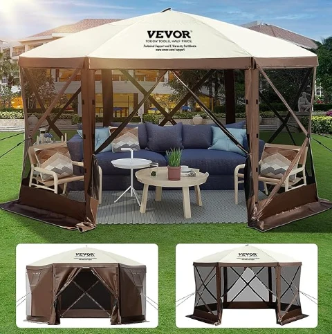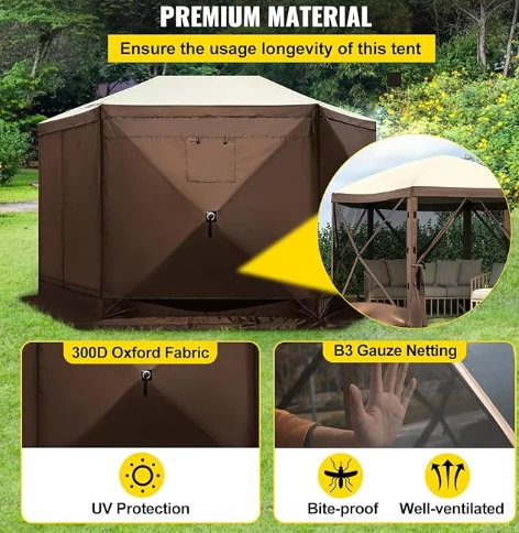 אוהל חופה קמפינג אטום לגשם, אוהל קמפינג גזיבו עשוי מבד אוקספורד 300D ורשת B3 גזה. זהו IPX3 אטום למים, אטום לנשיכה, ועמידה בפני UV. חופת הגזיבו בגובה 12 'x 12' מספקת מרחב גדול לשימוש במקלט חיצוני.