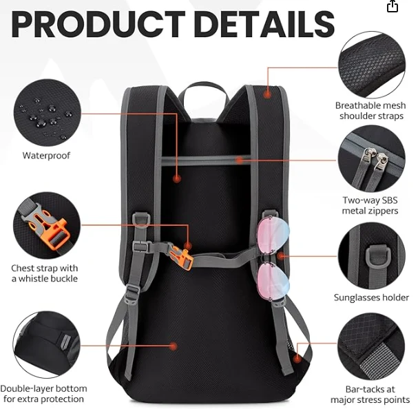 תרמיל מתקפל בטיולים אטומים למים, קליפ חזה עם אבזם שריקה עובד בצורה מושלמת להפצת משקל החבילה ולשמור עליו יציב ומרכז. חובה לספורט, טיולים רגליים וקמפינגז'ג'יאנג ג'יאו מוצרי חוץ ושות 'בע"מ שיפור הנראות במהלך פעילויות בחוץ ליליות. תכנון זה מבטיח לך להישאר גלוי לאחרים, מגדיל את הבטיחות כשאתה בחוץ לאחר רדת החשכה